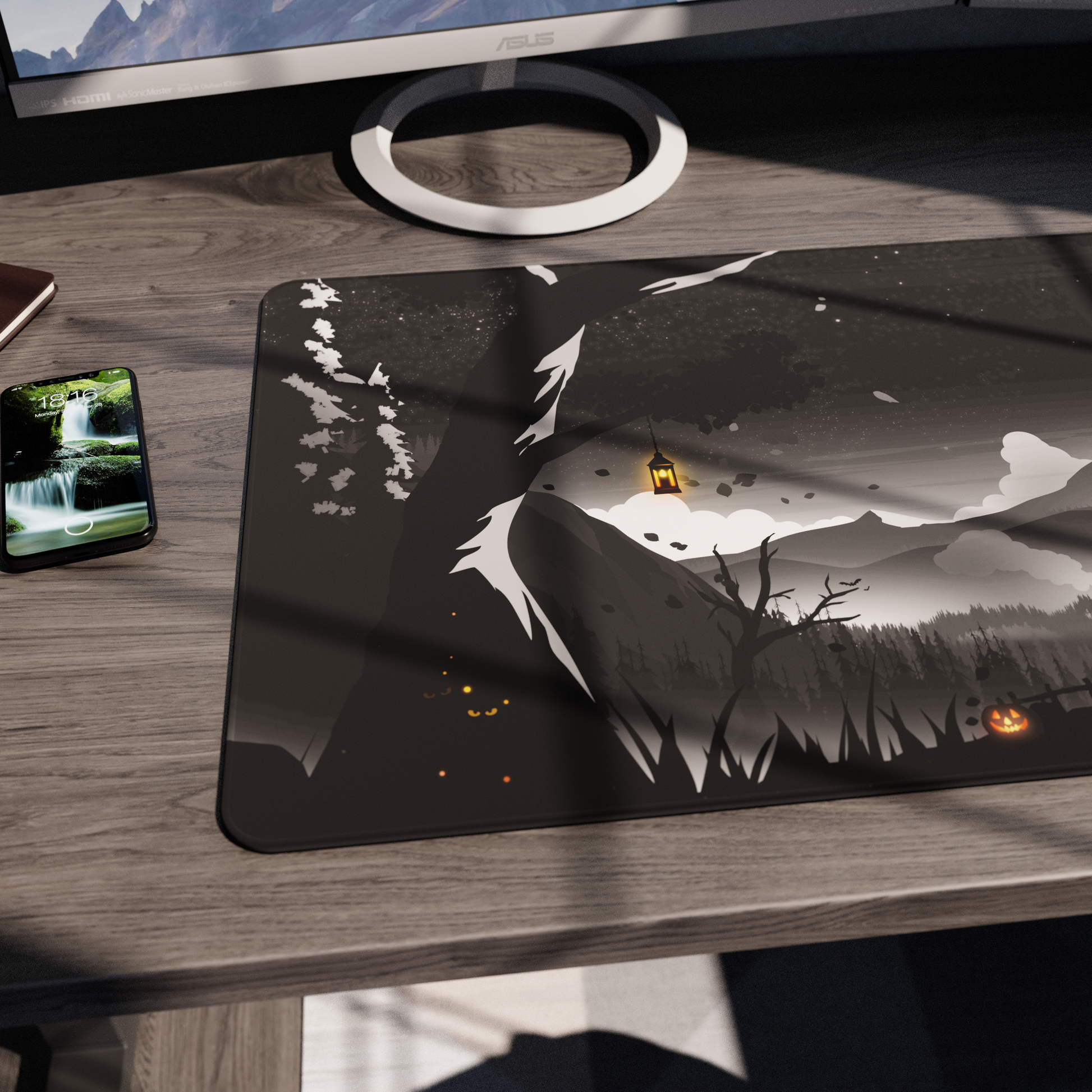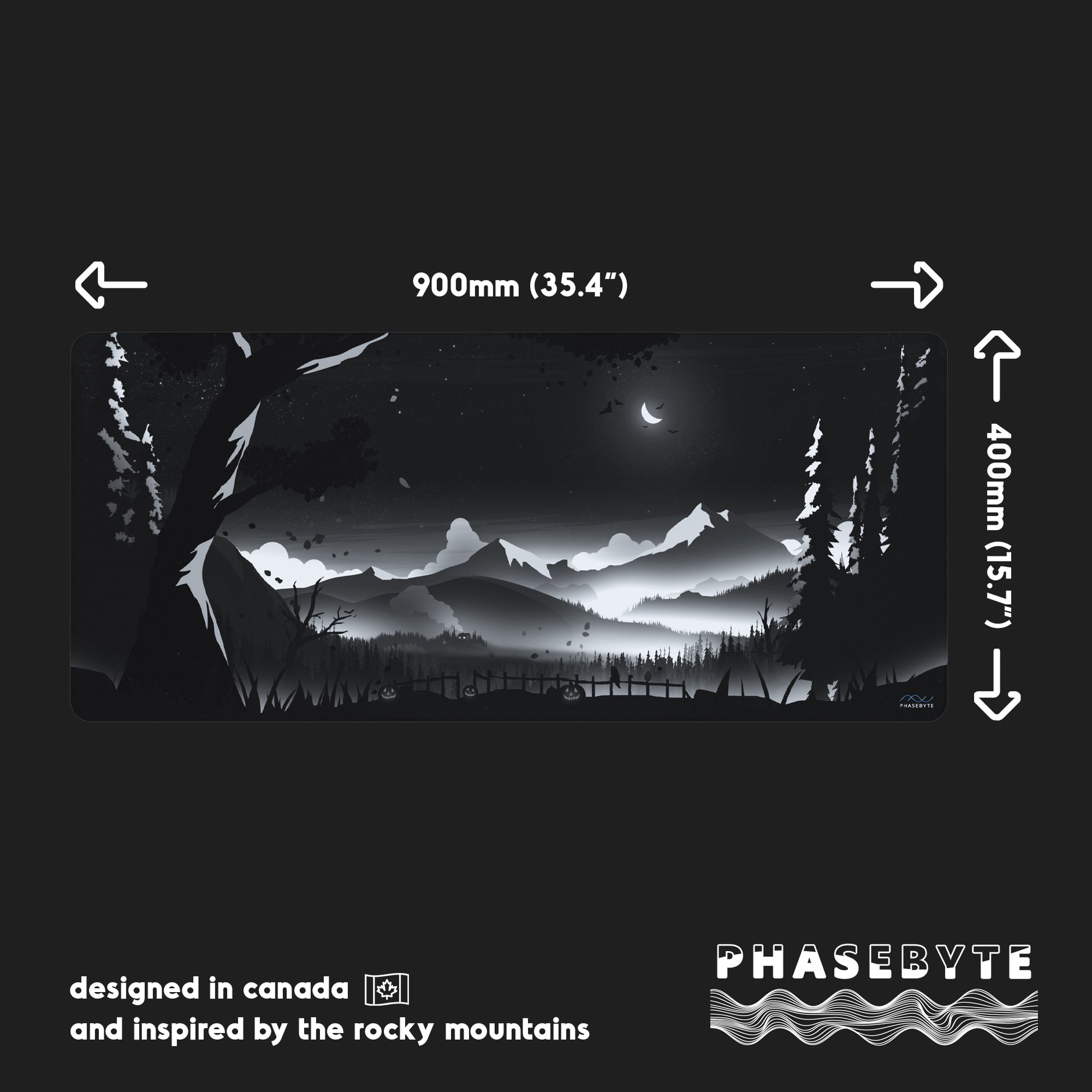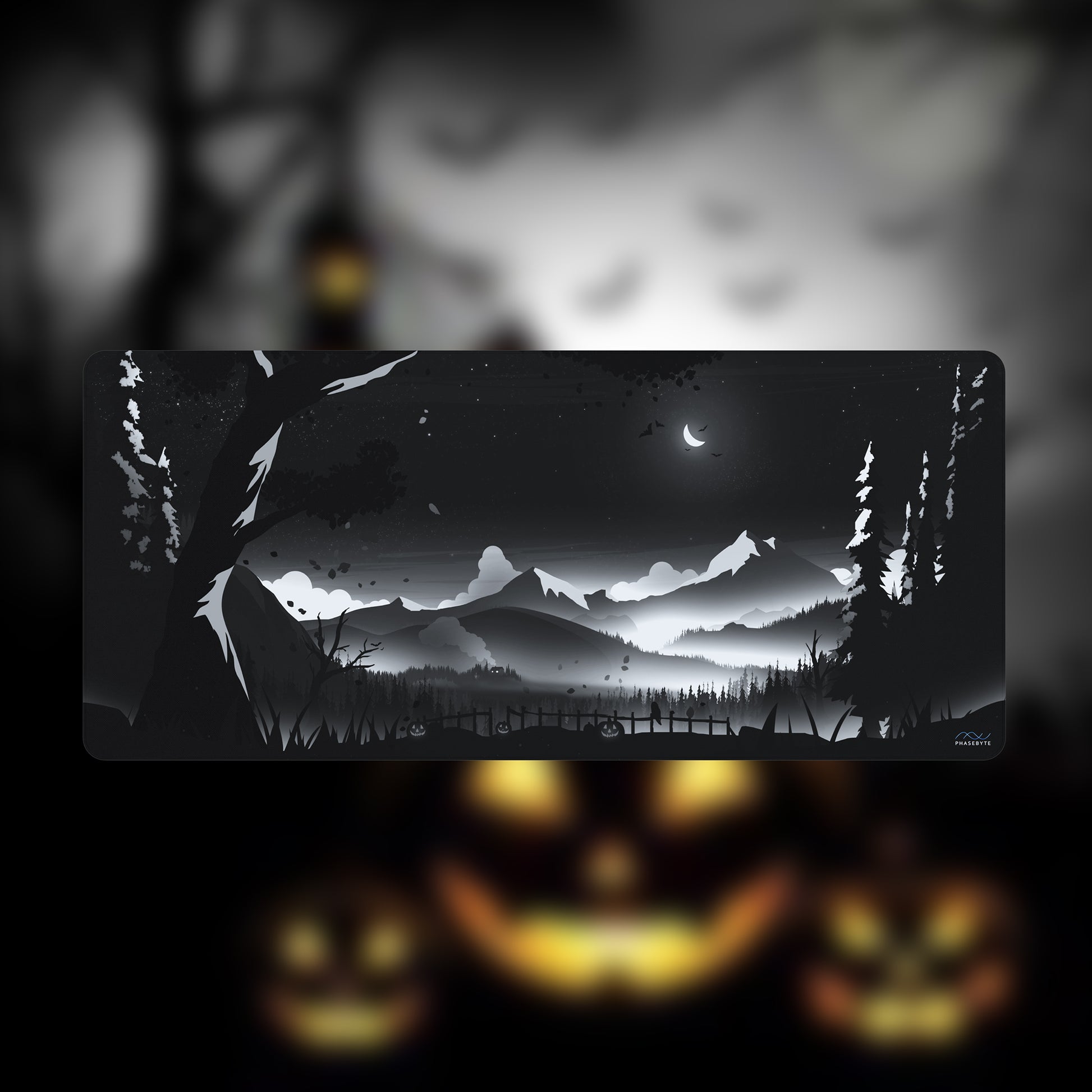 At long last, a dark sky Hidden Peak. Inspired by our favorite season, Hallow Peak is a spooky twist on our most popular deskmat. Jack-o-lanterns glow across a dark autumn landscape in this limited edition deskmat, designed with a cloth top and rubber underlay with design that runs through the stitching.