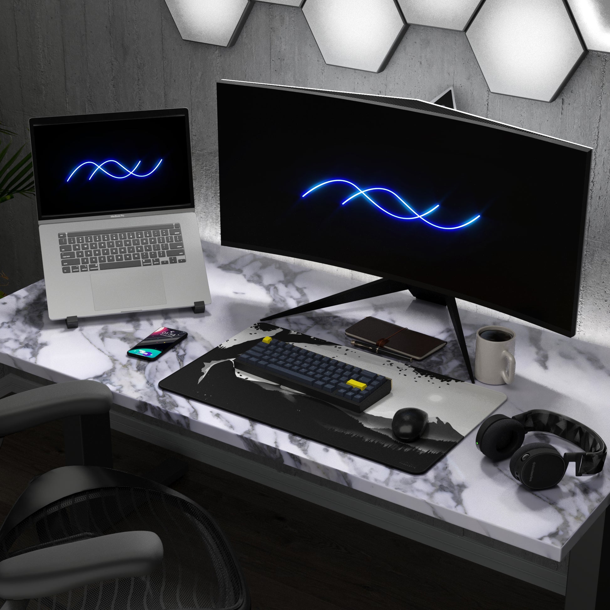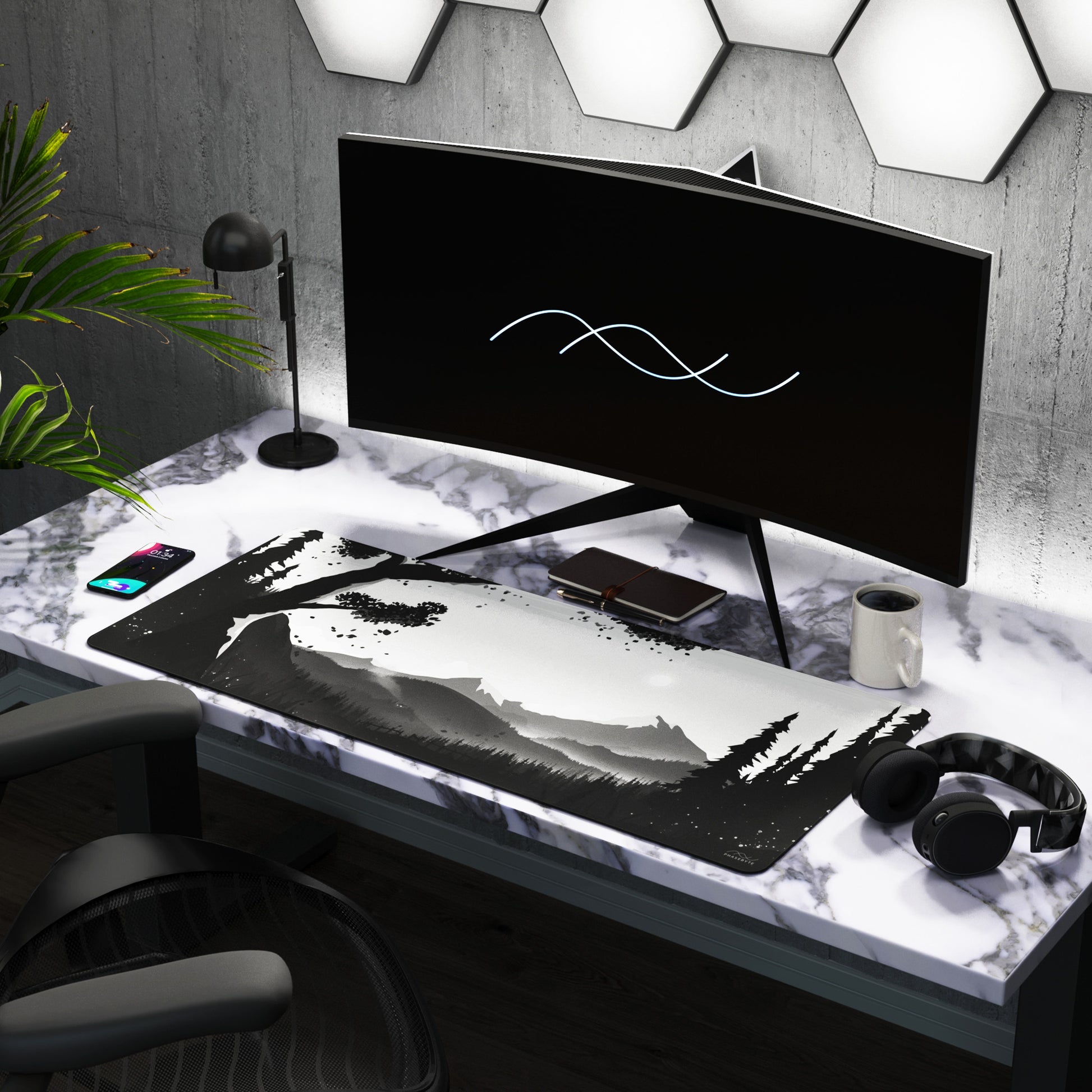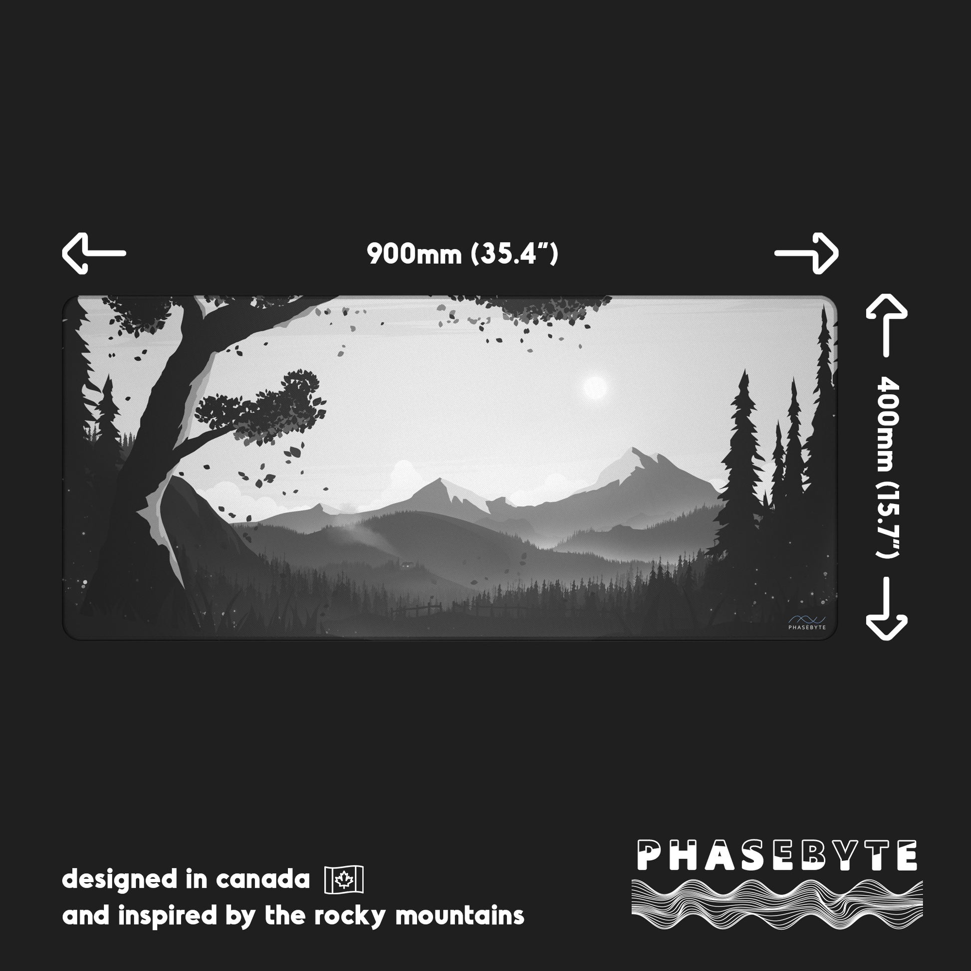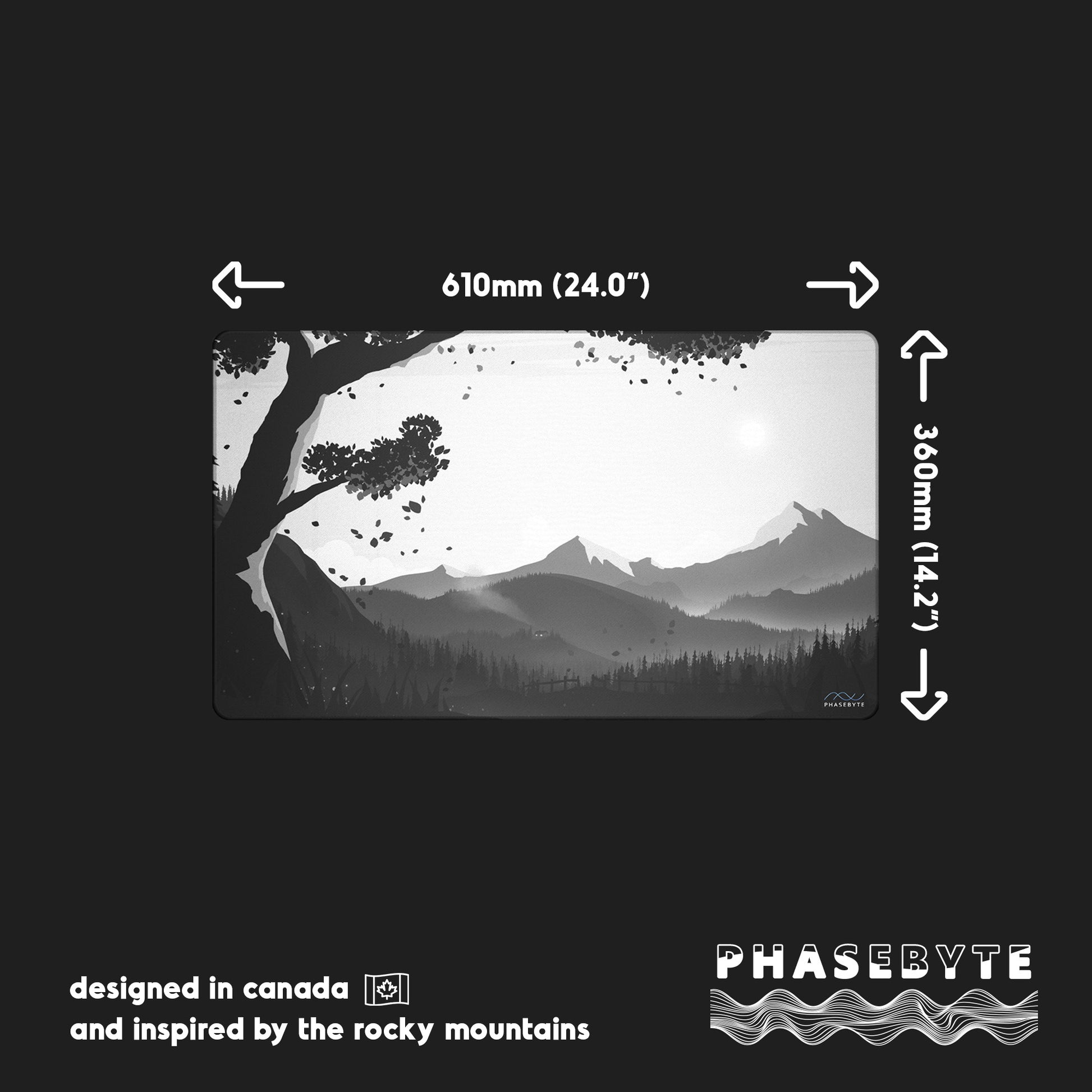 Hidden Peak is our black and white deskmat. It features stunning tones and intricate details across a mountain scape with design that runs through the stitching.