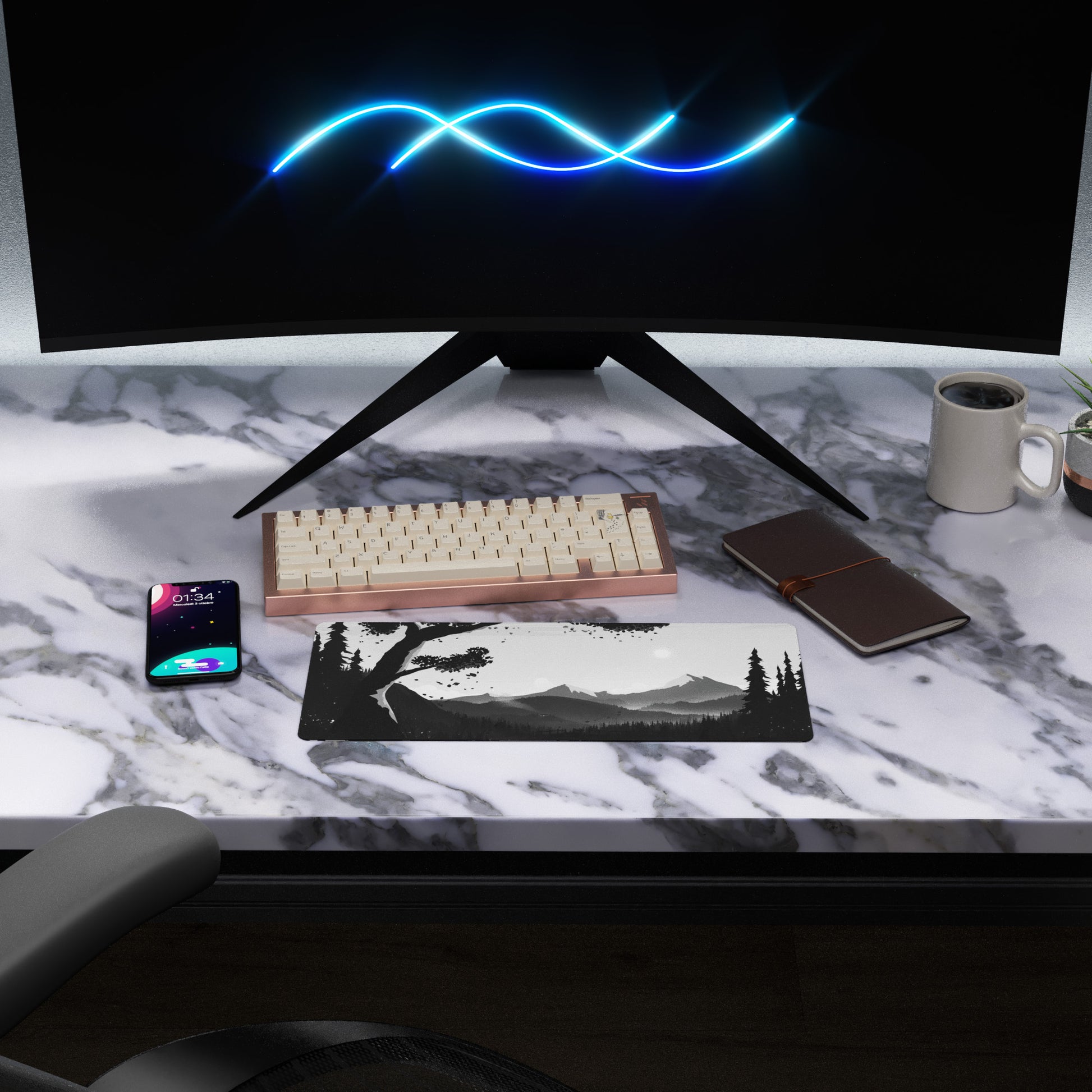 The Hidden Peak Mini Mat is perfect for all your accessories. Use it for your keyboard, controllers, jewelry or anything else that fits! It features stunning tones and intricate details across a mountain scape with design that runs through the stitching.