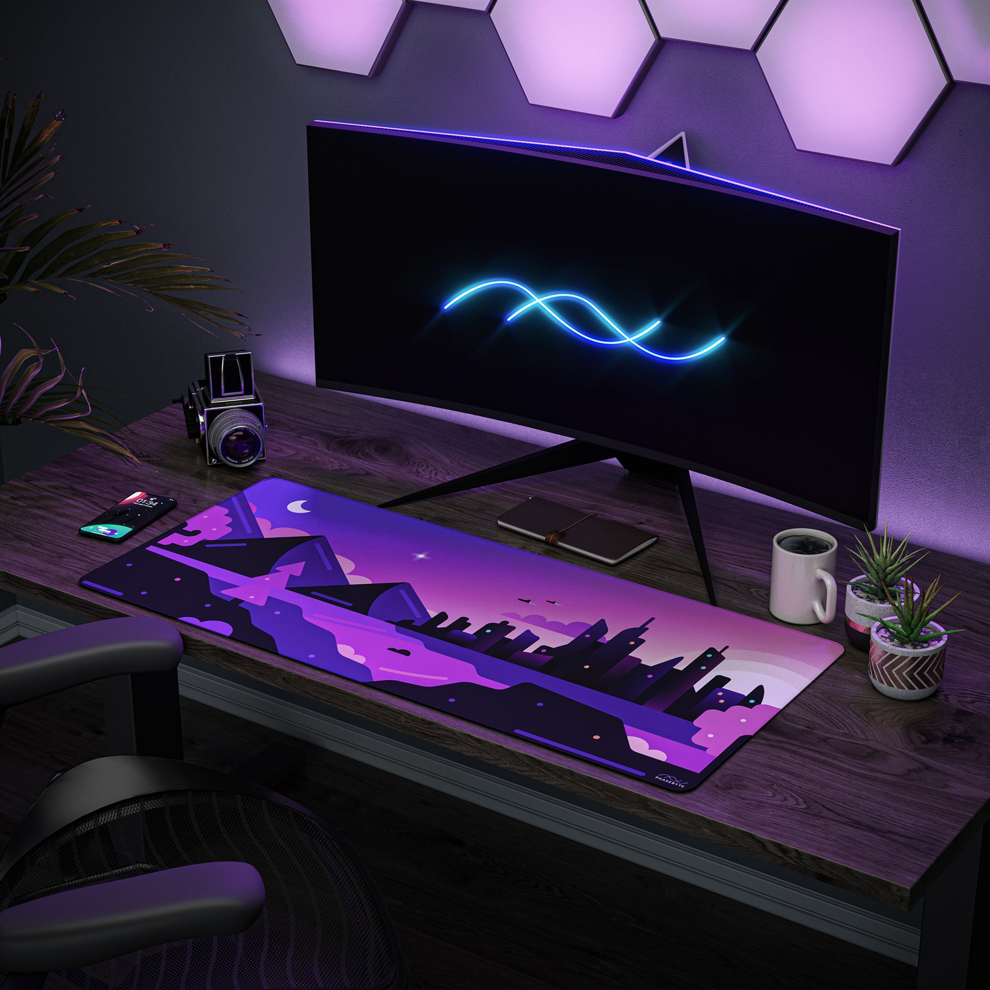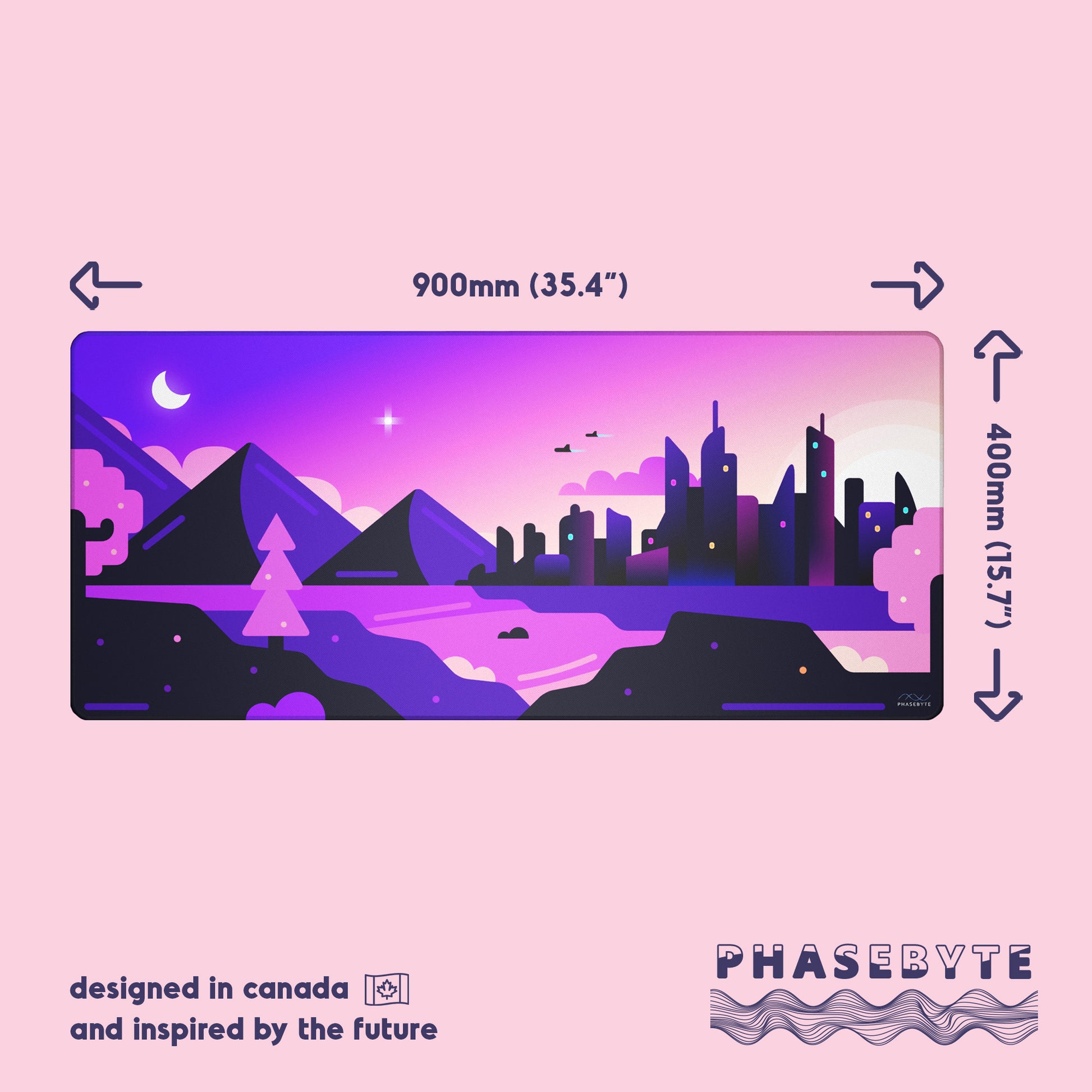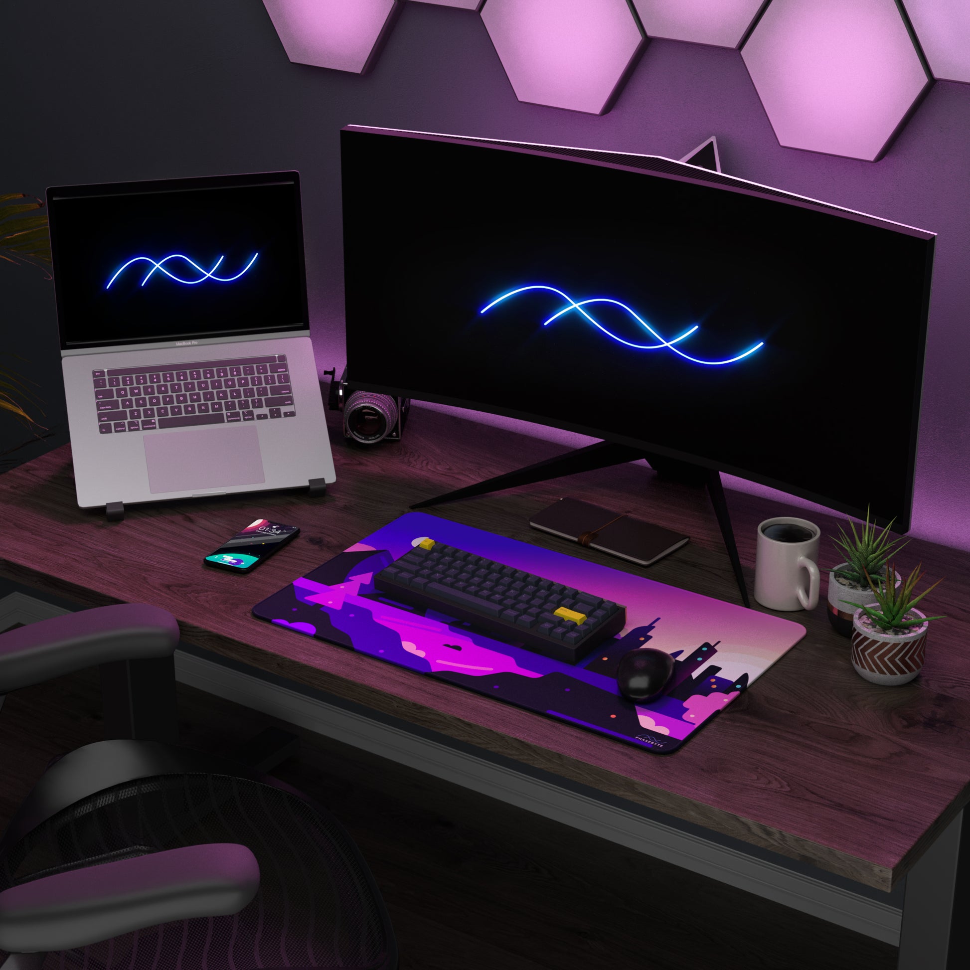 Gradients and simple shapes come together to form a city of the future. Moonrise to sunset, Interstellar City is a beautiful deskmat. The deskmat features a cloth top and rubber underlay with design that runs through the stitching.
