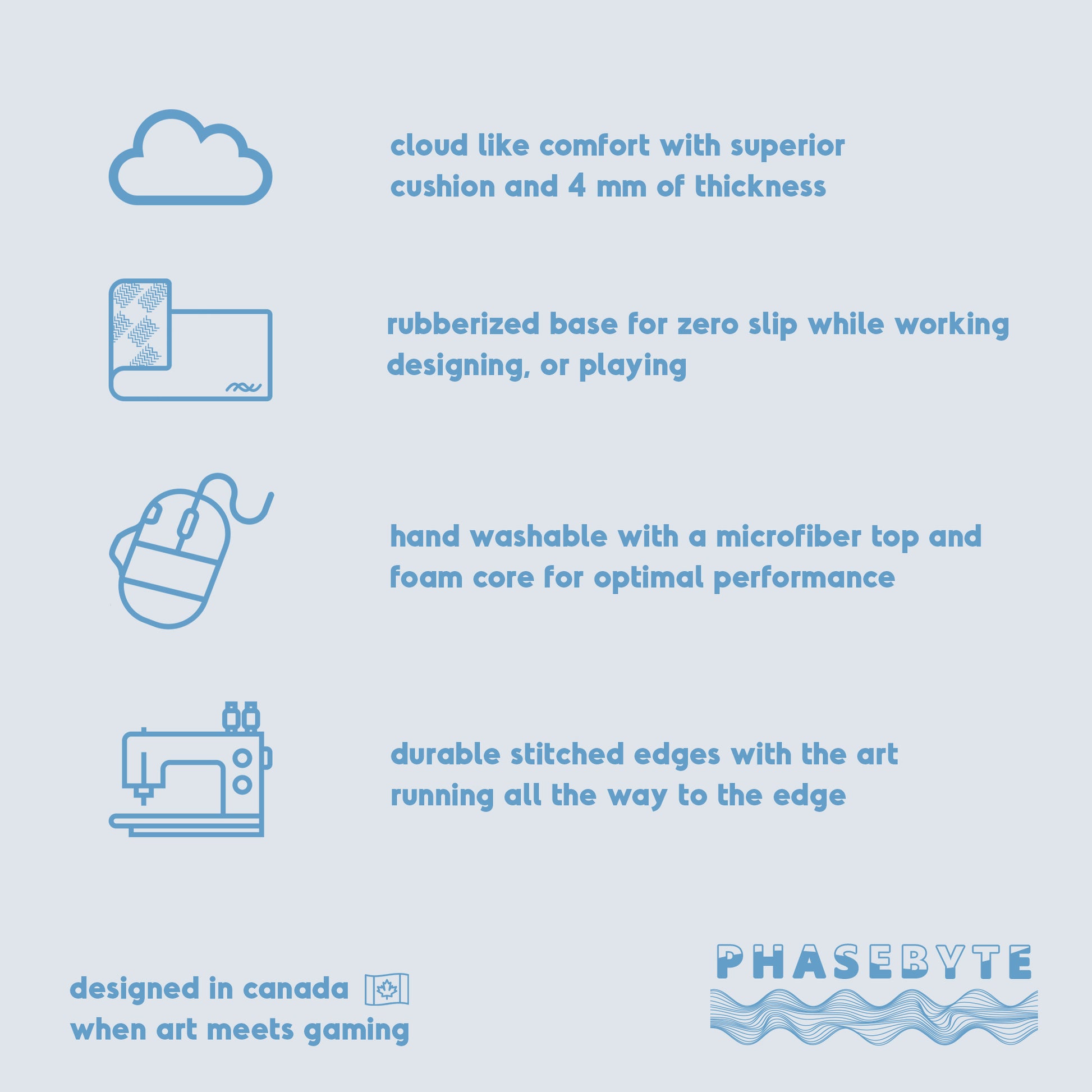 With superior foam core cushion and a total of 4mm of comfort, your wrists will be right at home on any mouse pad.