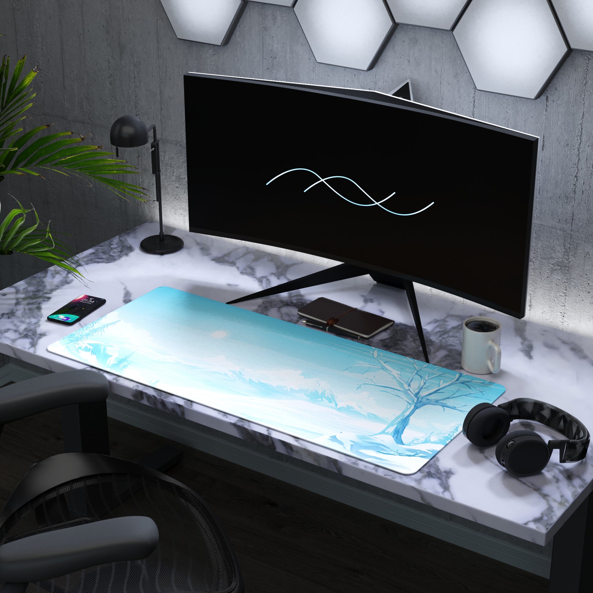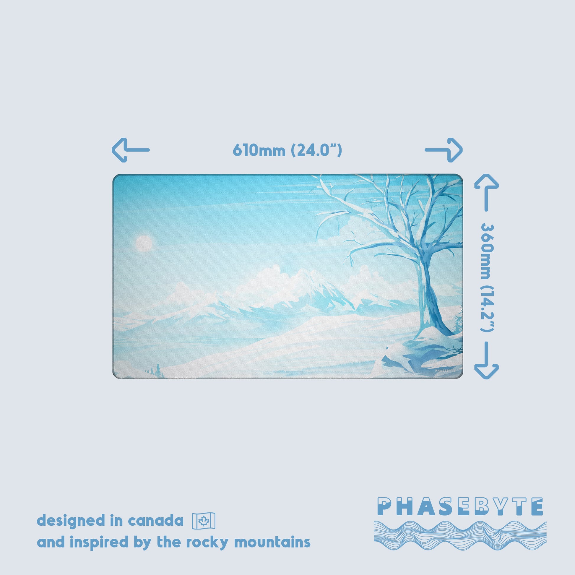 Snowy Peak is our ice blue and frost white deskmat. It features a gorgeous winter scene across a frosted mountain scape with intricate design that runs through the stitching.