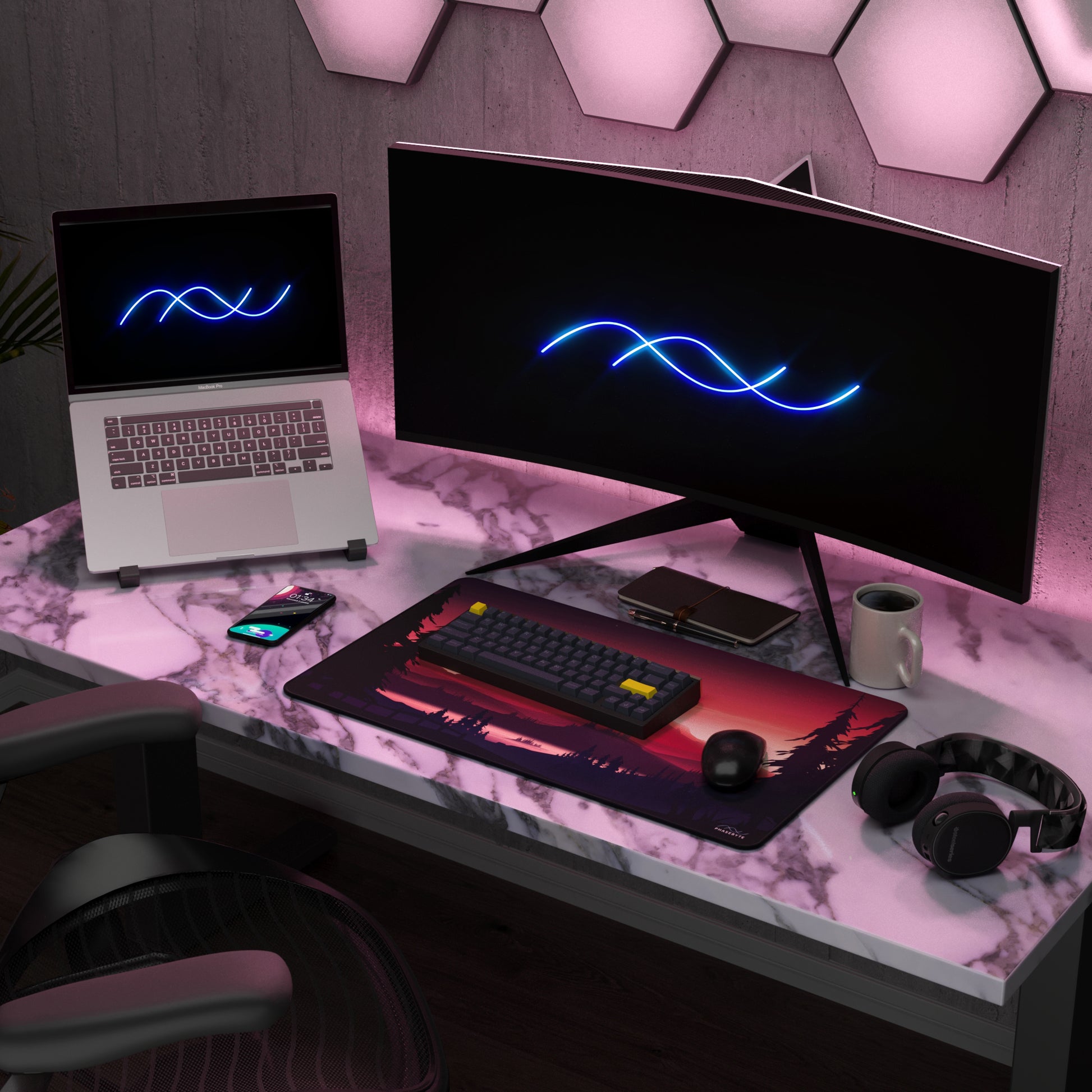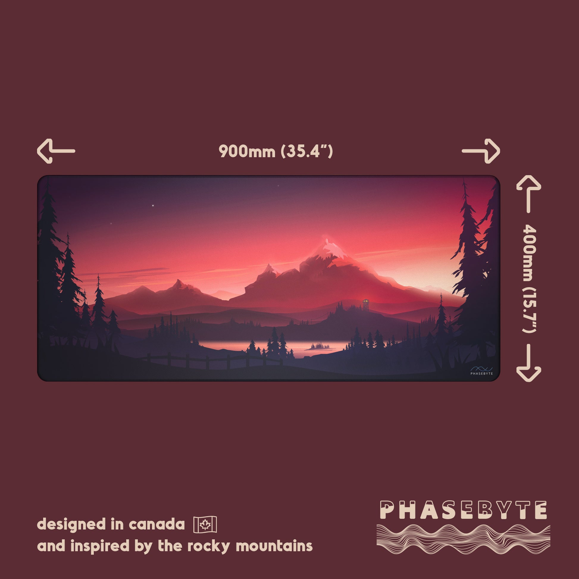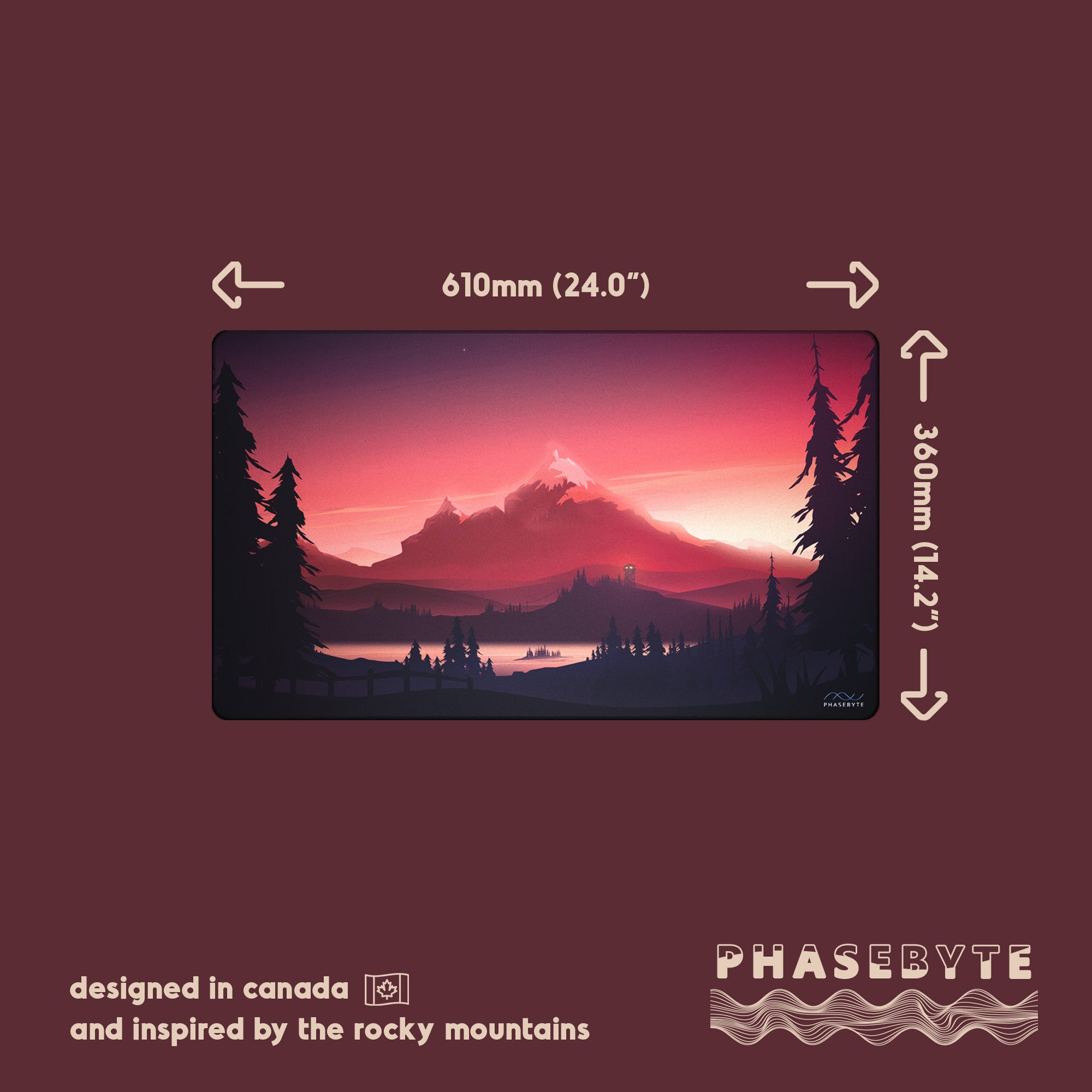 Mystic Peak is our vivid red and bold black deskmat. It features a distant snowy mountain peak with intricate details and design that runs through the stitching.